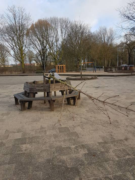 Locatieleider Martijn Helmers trof de omvergetrokken boom vanochtend aan op het schoolplein. ,,Het is echt schandalig. Ik heb direct foto’s gemaakt om aangifte te doen.”
